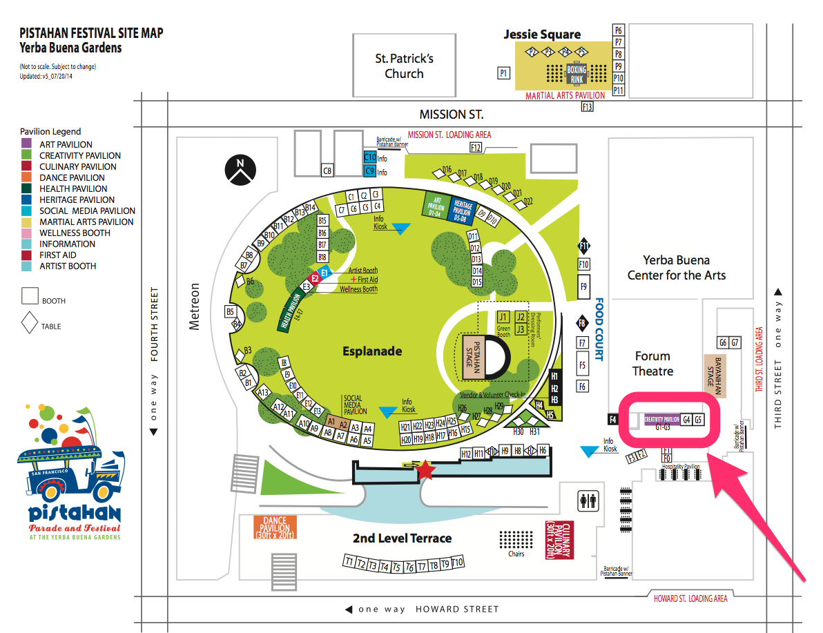The Creativity Pavilion is located towards the Third Street side of Yerba Buena Gardens, around the corner from the Bayanihan Stage and Food Court. Click image to embiggen.